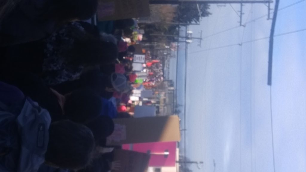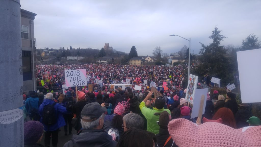 My partner Bhakti Watts and I did not have Pussy Hats, but we made a decision to march in the Seattle Womxn’s March yesterday starting at Judkins Park and we were glad we did. We had sunshine for much of the route and found ourselves quite moved by the messages of hope and solidarity. There was a light feeling the whole time and we saw only two men yelling. One had a sign that said “Trump Fascist” and was yelling “PERVERT! PERVERT!” One older woman said quietly “You’re not helping.” Another man was attempting to get a segment of the crowd to yell “Black Lives Matter” but it felt to me like it was a day that men should be seen and not heard.