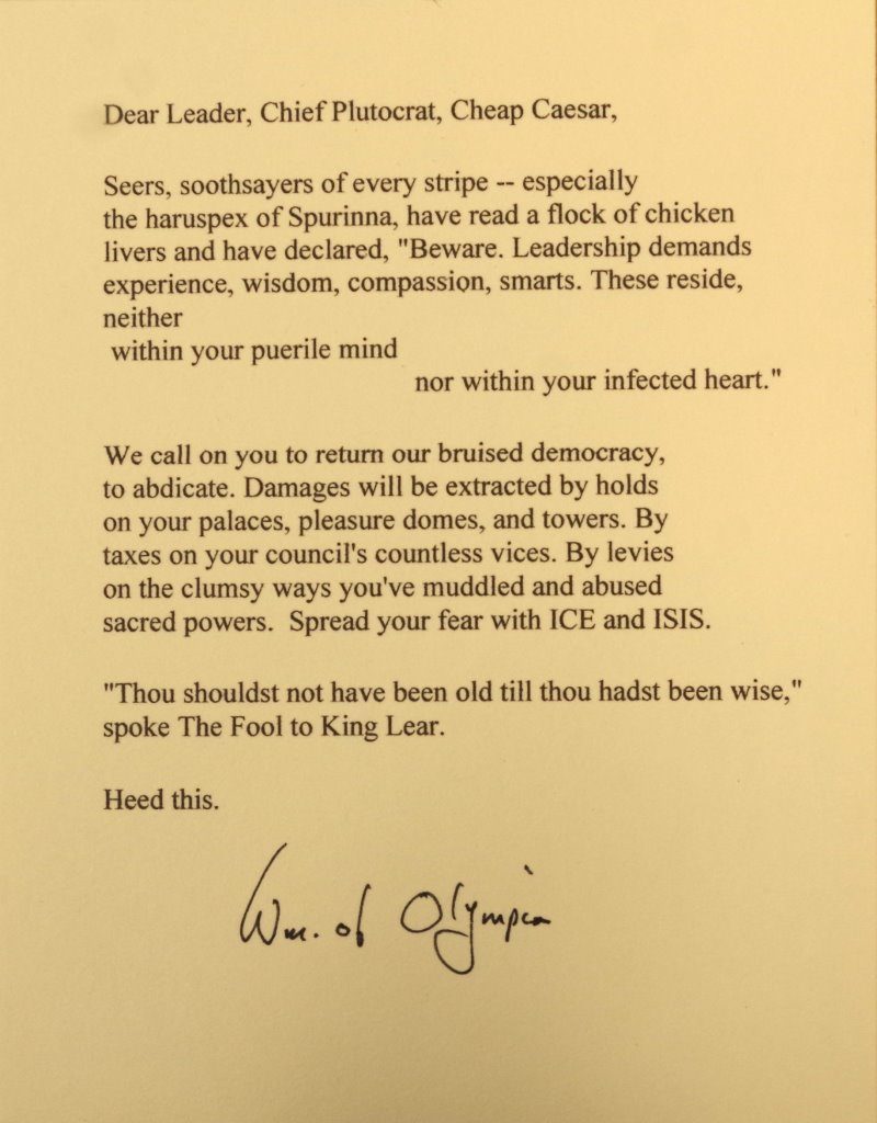 I would write at least two postcards and entrusted them to Alison for the ceremonial mailing, but the REAL poet of the day was Bill Yake, who authorized my request to publish HIS contributions to the latest protest against the illegitimate caudillo: