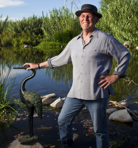 Lewis MacAdams, founder of Friends of the Los Angeles River, stands in the river with a statue of a great blue heron on Aug. 3, 2010. (Jay L Clendenin / Los Angeles Times)